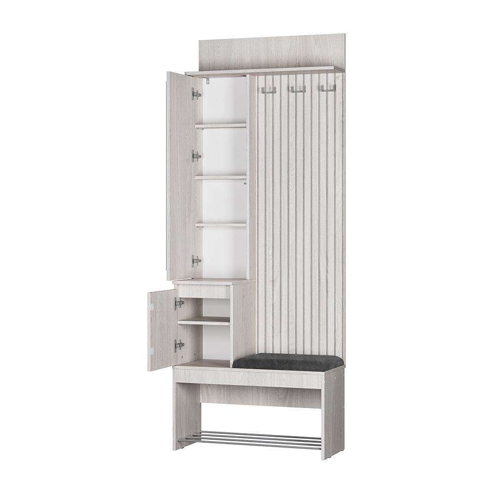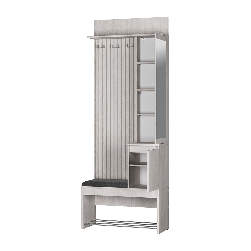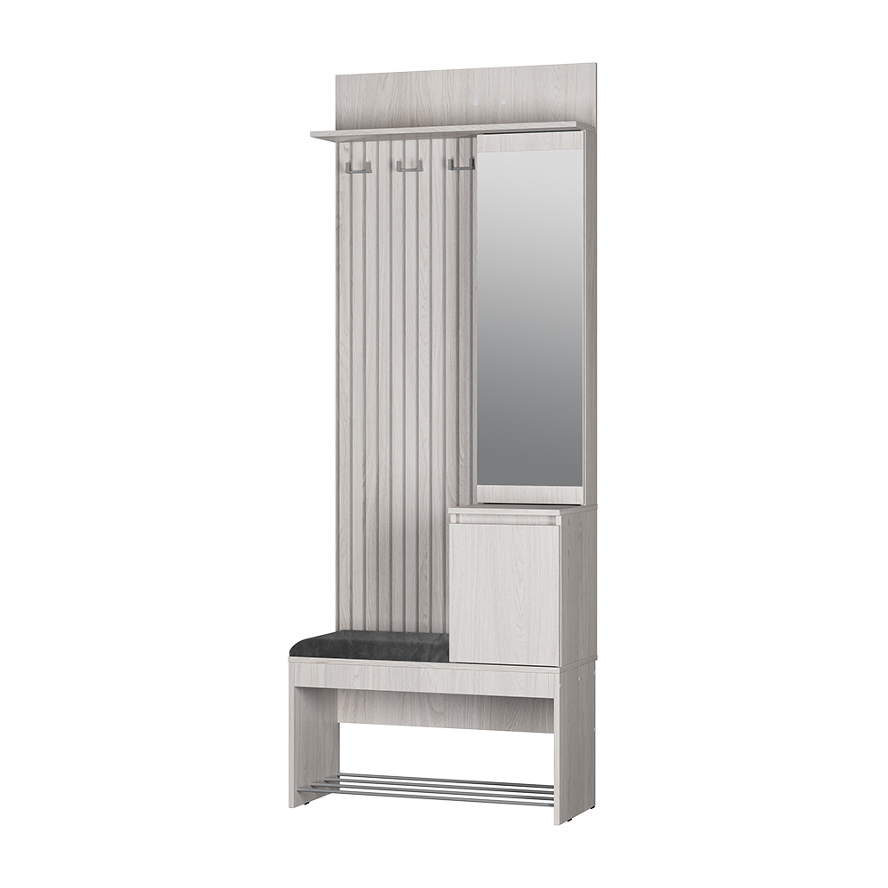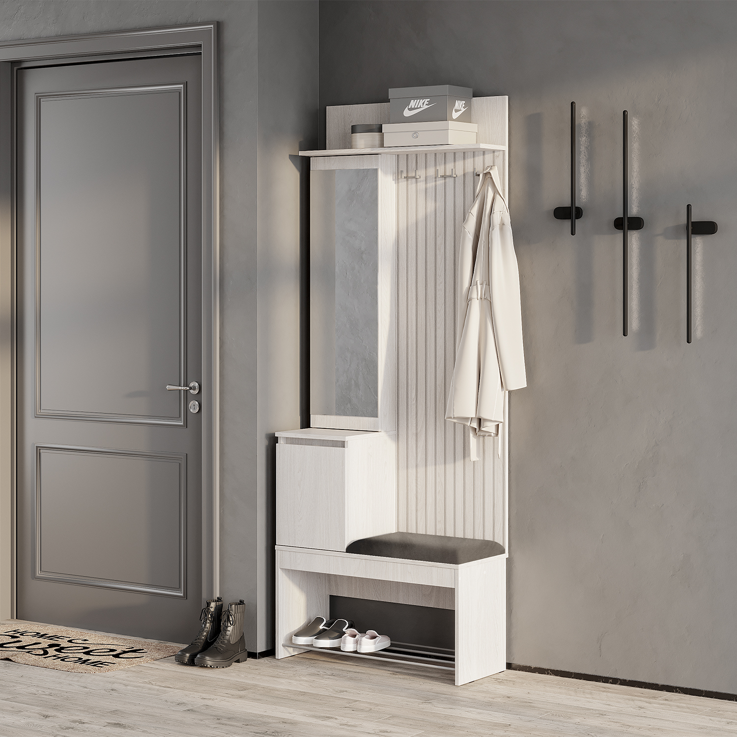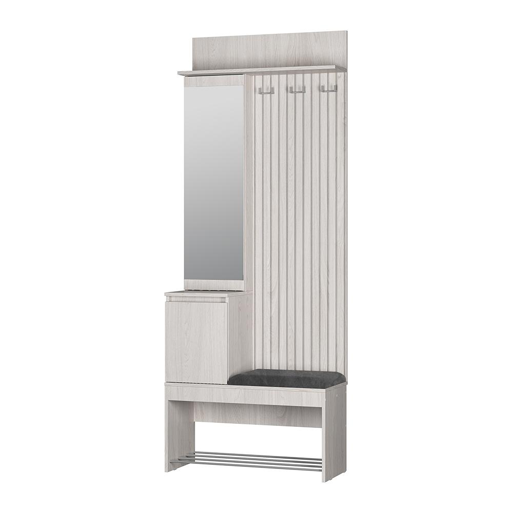 Современная прихожая ЛАМА в светлом оттенке Ясень белый станет стильным акцентом вашего интерьера благодаря эффектной фотопечати 3D рейки, имитирующей объемный деревянный декор. Эта функциональная маленькая прихожая с зеркалом шириной 802 мм идеально организует пространство: она оснащена тремя двухрожковыми крючками, закрытыми полками и практичной обувницей с металлическими трубами, которая обеспечивает проветривание и сушку обуви. Комфорт при переобувании гарантирует мягкое сиденье из тактильного велюра цвета Графит, а универсальная сборка позволяет адаптировать конструкцию под любую планировку. Если вы хотите купить прихожую с мягким сиденьем, сочетающую трендовый дизайн и эргономику, модель ЛАМА — ваш лучший выбор для компактного коридора.