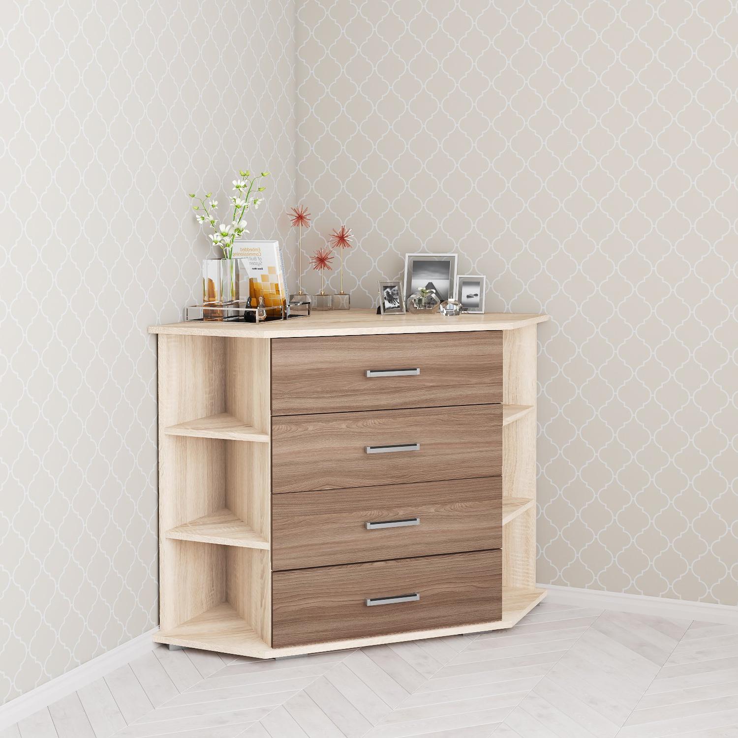- Комод угловой КАТРИН-7 с открытыми полками и выдвижными ящиками