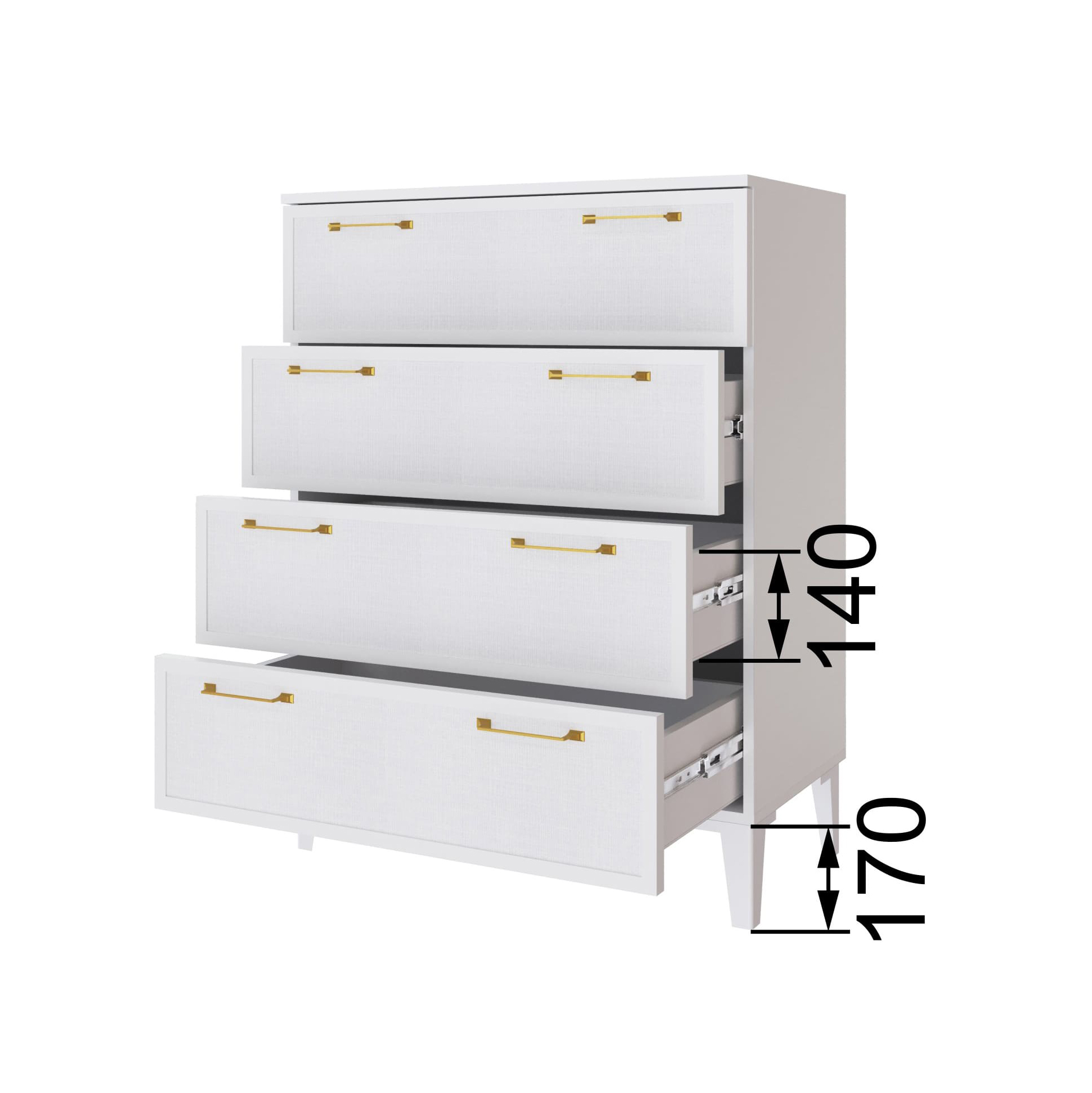 - Четыре выдвижных ящика на направляющих полного выдвижения с доводчиками обеспечивают удобное хранение одежды, белья и других вещей.