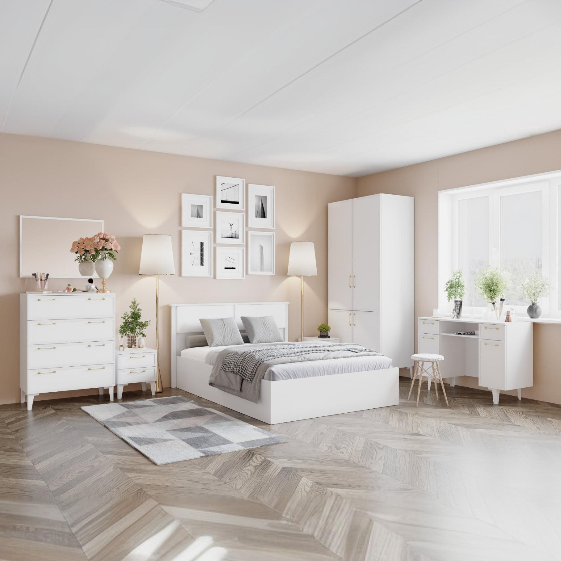 - Лаконичный дизайн с элегантными золотистыми ручками и возможностью выбора из двух цветовых решений (белый/белый или графит серый/графит серый) позволяет комоду легко вписаться в любой интерьер.