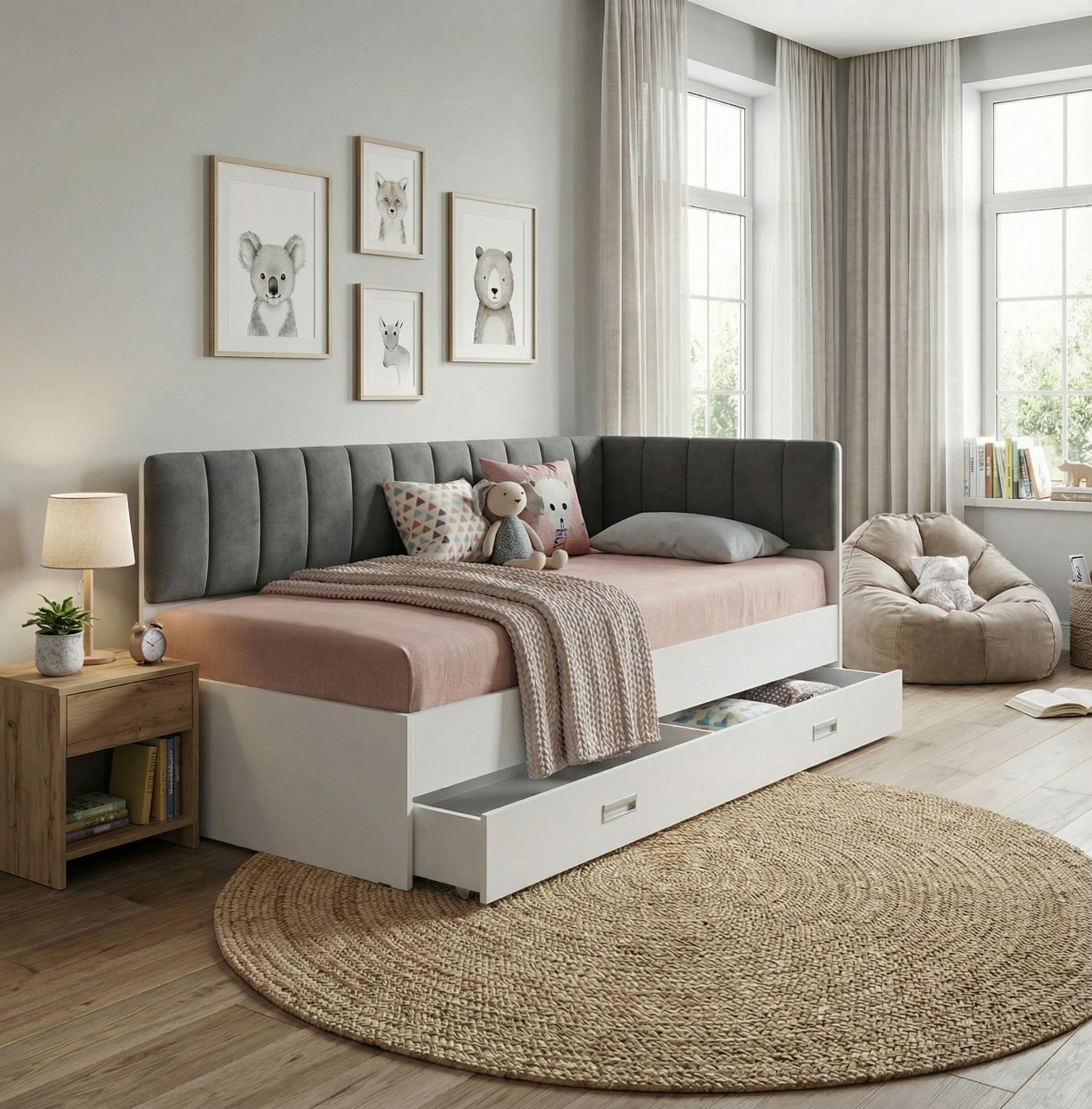 Стильная кровать-15 с мягкими спинками правая в эффектном контрастном дизайне — белоснежный корпус и практичная обивка велюр графит — станет идеальным решением для современной детской, подростковой или гостевой комнаты. Спальное место оптимального размера 900х2000 мм оборудовано надежным реечным основанием (ладе), которое гарантирует правильную вентиляцию матраса и комфортный, здоровый сон. Для грамотной организации пространства под спальным местом предусмотрен вместительный выкатной ящик на колесах-роликах, который удобно разделен на две независимые ниши для хранения постельных принадлежностей, сезонной одежды или игрушек. Если вы планируете купить односпальную кровать 90х200, которая сочетает в себе трендовую эстетику и высокую функциональность, эта белая кровать с ящиком и мягкими графитовыми элементами обеспечит непревзойденный уют и поможет поддерживать безупречный порядок.