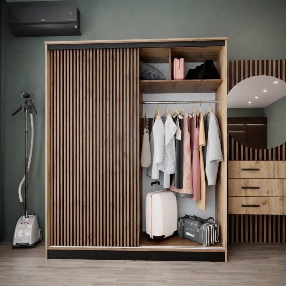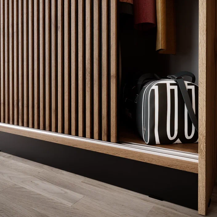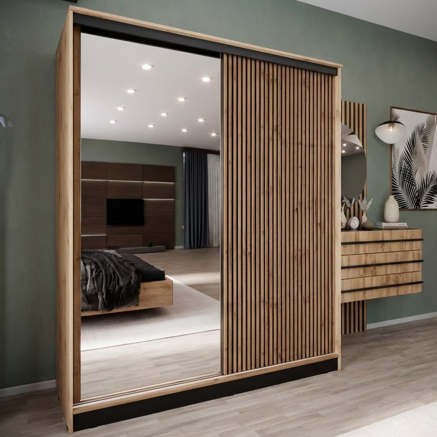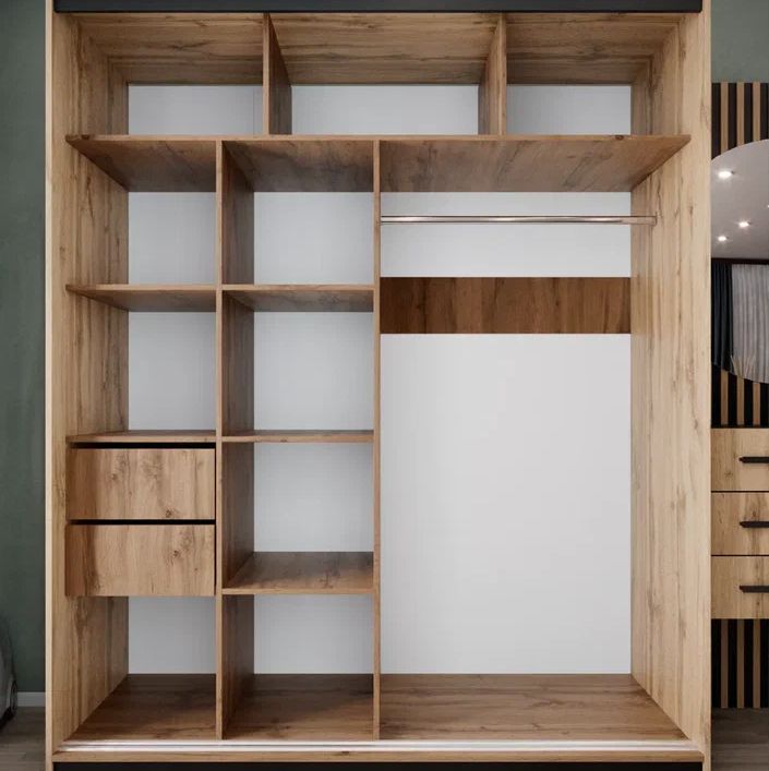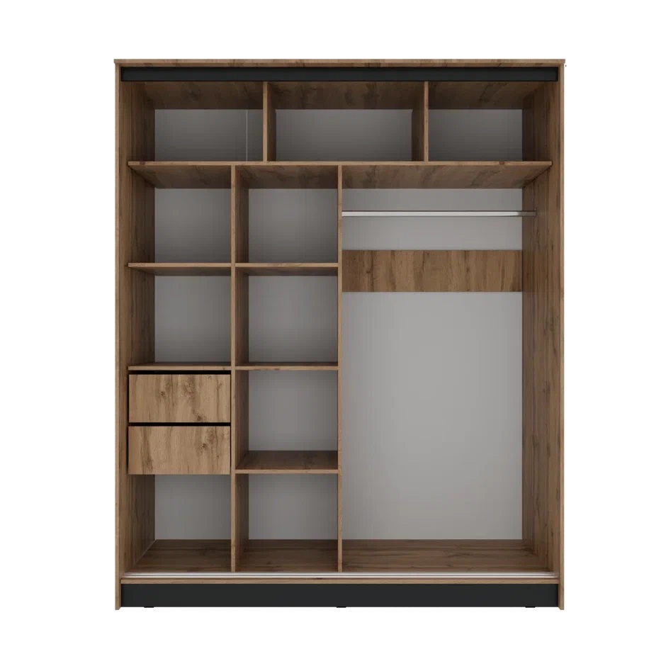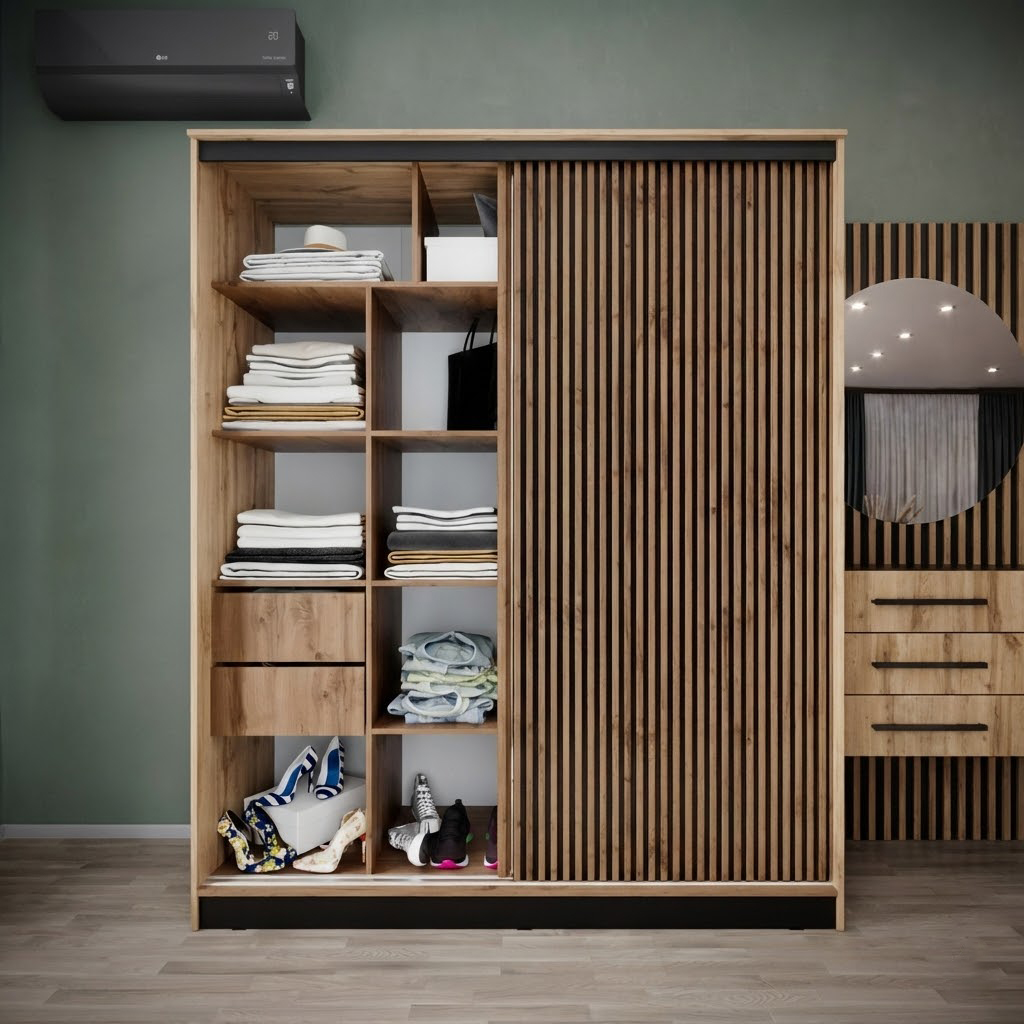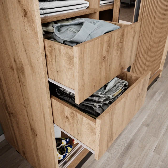 Вместительный шкаф-купе АЭЛИТА 1800 — это идеальное сочетание современного стиля и безупречного порядка в вашем доме. Модель выполнена в актуальном декоре дуб вотан с черными акцентами, а уникальные декоративные рейки на фасаде придают мебели особый объем и графичность. Внутренняя эргономика продумана до мелочей: система включает 10 просторных полок, надежную прямую штангу для одежды и два выдвижных ящика, обеспечивая место для хранения всего семейного гардероба. Одна из дверей оснащена зеркалом в полный рост, которое не только удобно для примерки, но и визуально расширяет пространство комнаты. Если вы цените тишину и надежность, планируя купить большой шкаф-купе 180 см с плавным опорным механизмом, модель АЭЛИТА обеспечит вам долговечность и комфорт в повседневной эксплуатации.